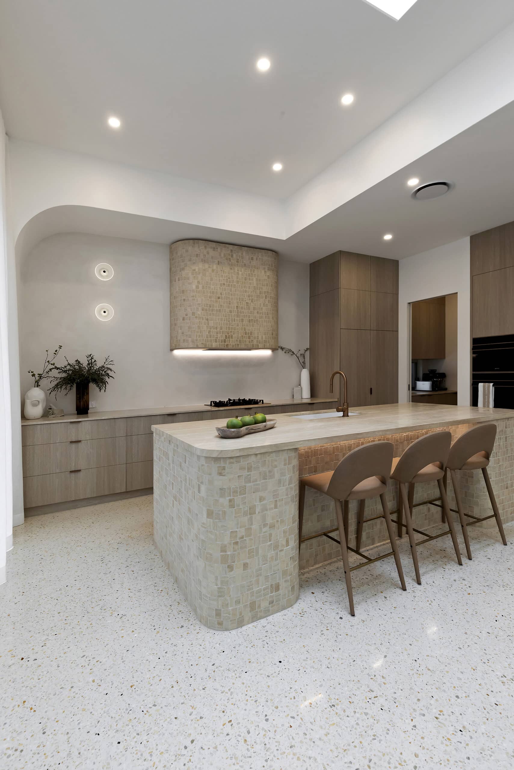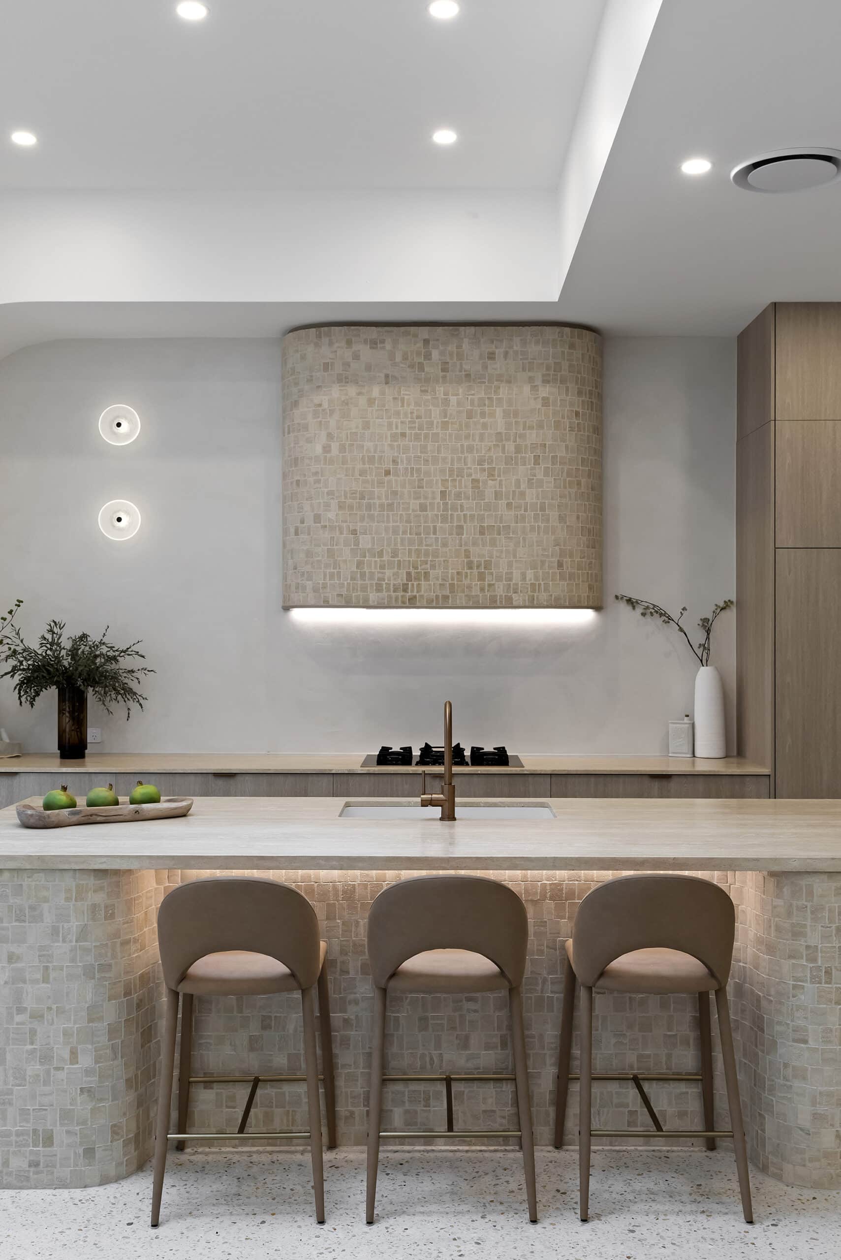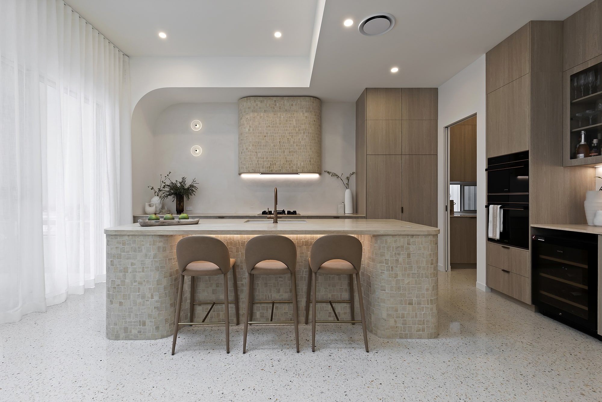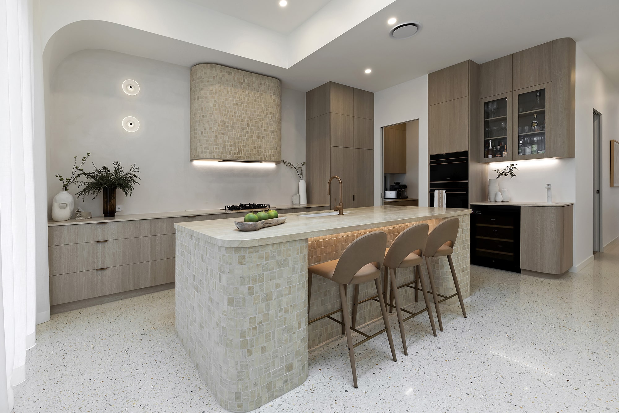 This bayside Manly kitchen reflects a balance of soft coastal tones and refined sophistication. A key design challenge was integrating functional elements into a highly stylised aesthetic. The statement mosaic-clad rangehood and curved island, with matching stone detailing, provide sculptural appeal while maintaining practicality. Soft timber tones, integrated appliances, and warm ambient lighting soften the clean lines. The client sought a kitchen that was both a showpiece and a functional hub — the solution delivers with seamless flow, considered storage, and tactile materials that elevate everyday living.