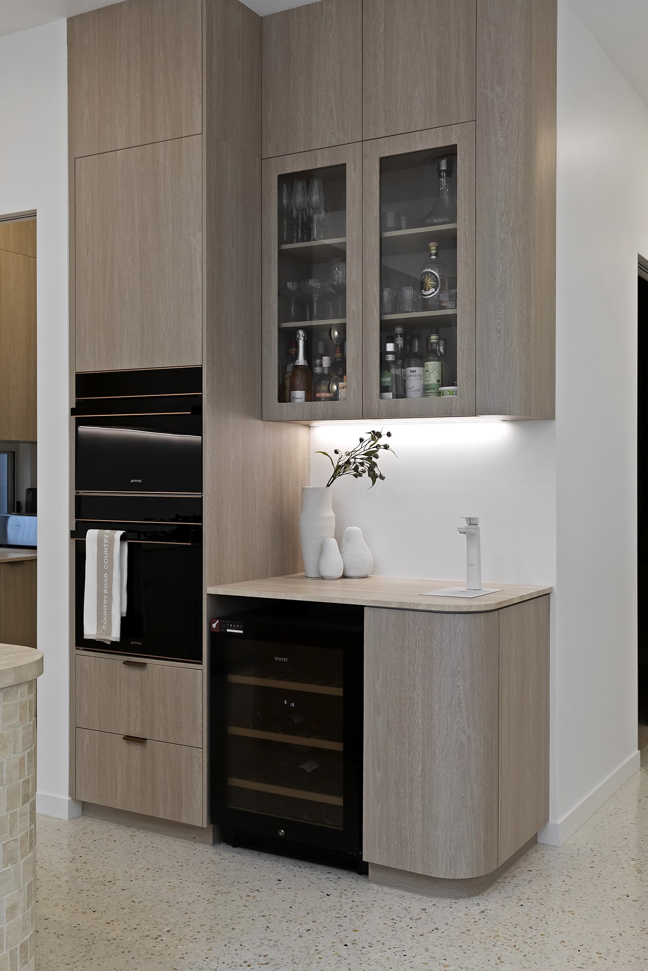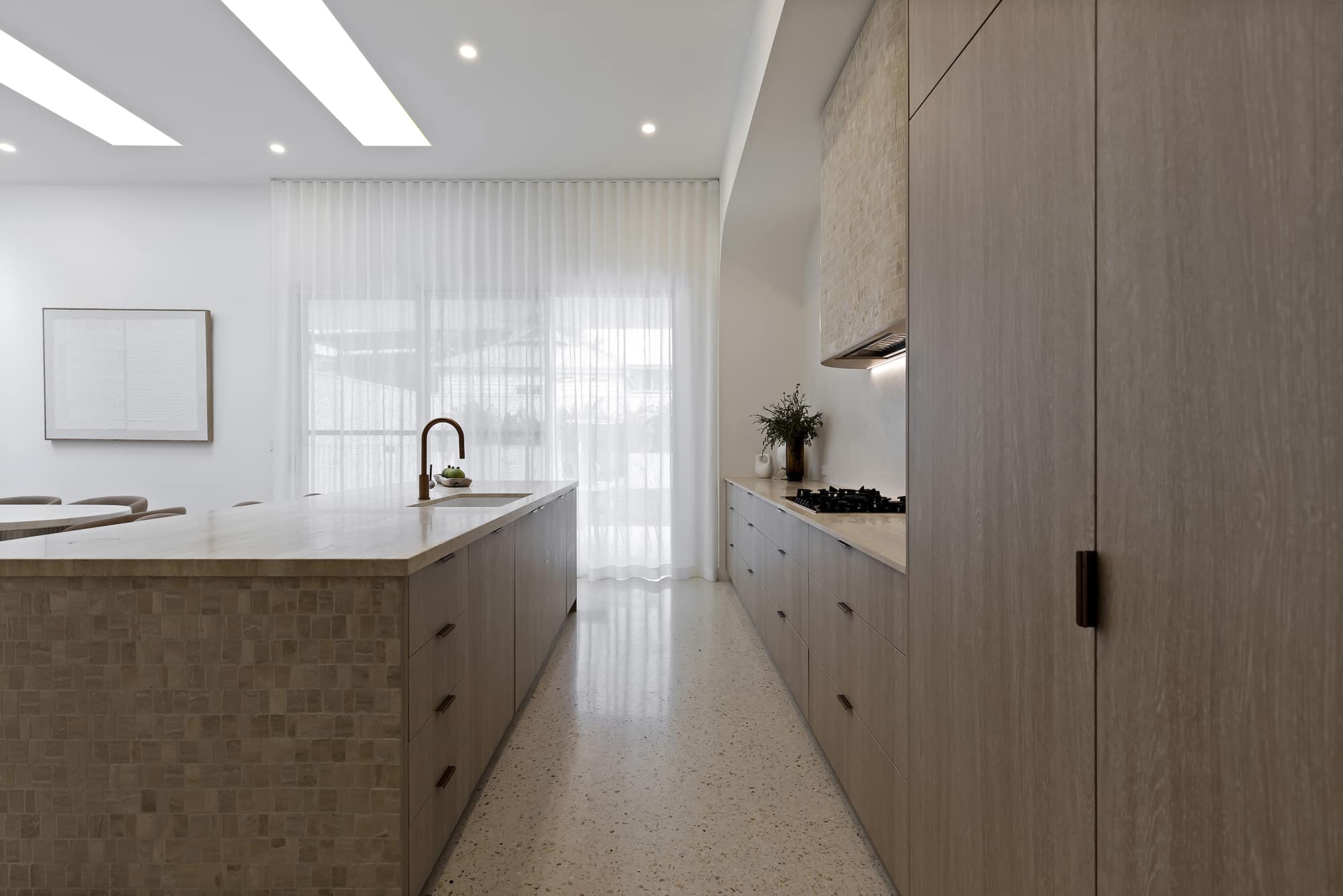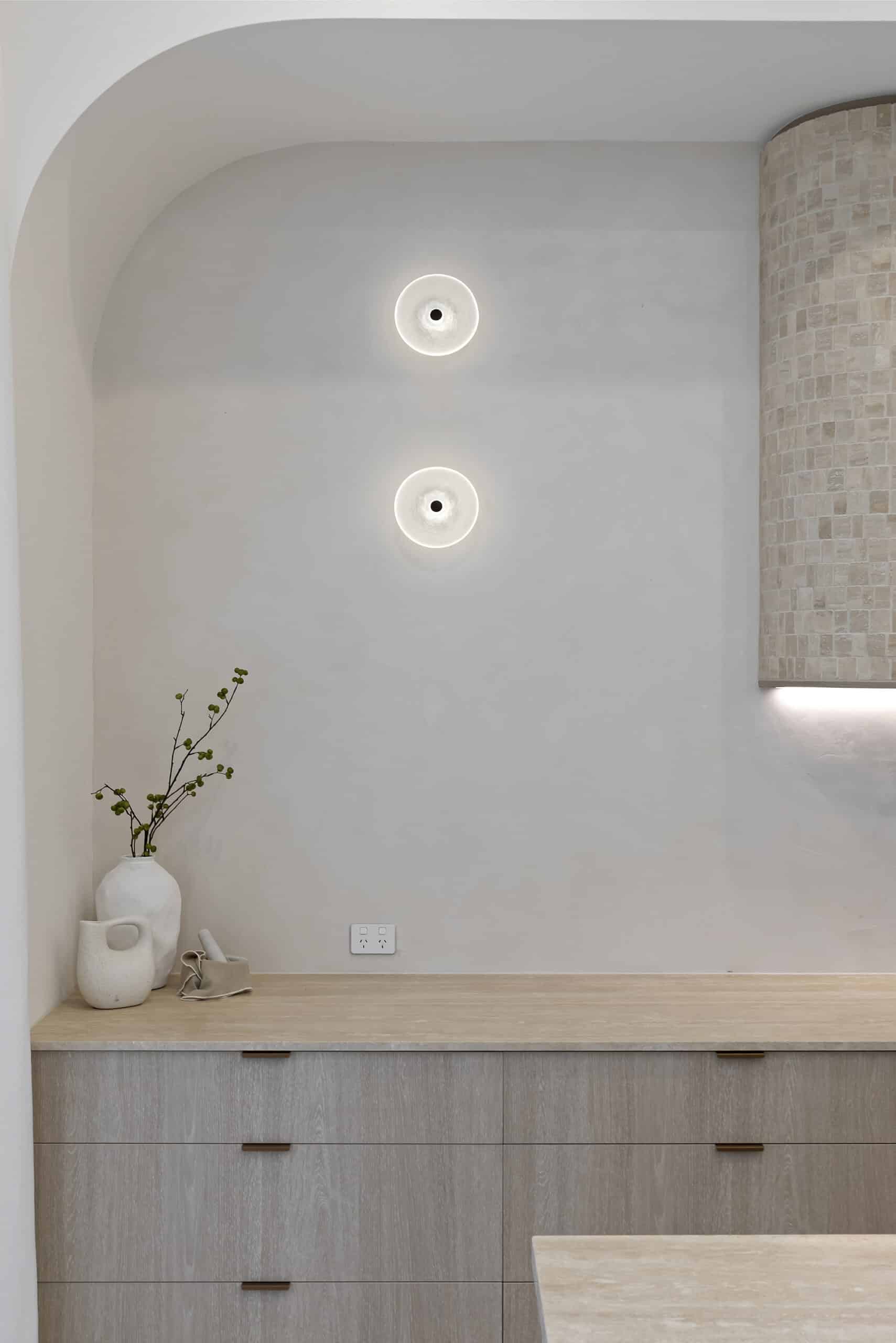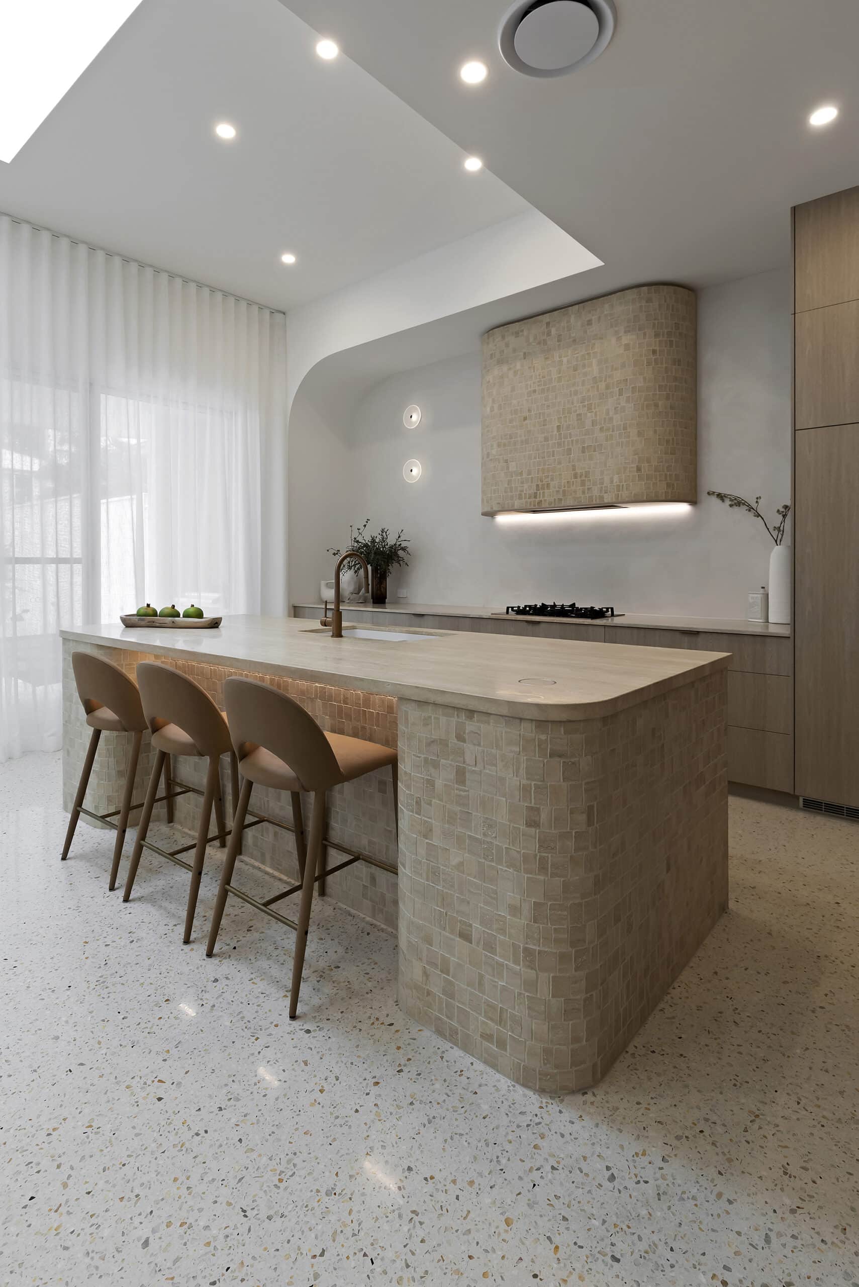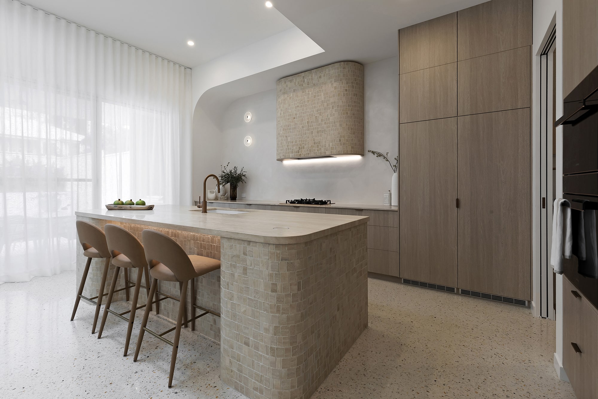 This bayside Manly kitchen reflects a balance of soft coastal tones and refined sophistication. A key design challenge was integrating functional elements into a highly stylised aesthetic. The statement mosaic-clad rangehood and curved island, with matching stone detailing, provide sculptural appeal while maintaining practicality. Soft timber tones, integrated appliances, and warm ambient lighting soften the clean lines. The client sought a kitchen that was both a showpiece and a functional hub — the solution delivers with seamless flow, considered storage, and tactile materials that elevate everyday living.