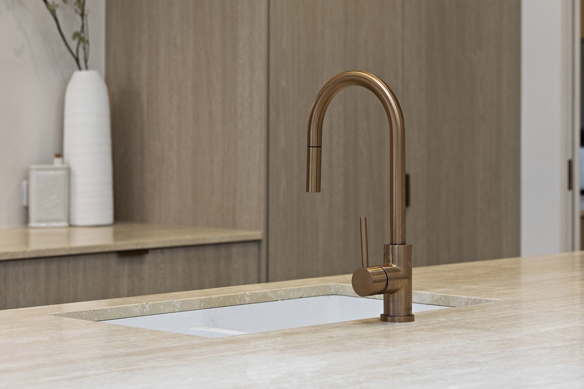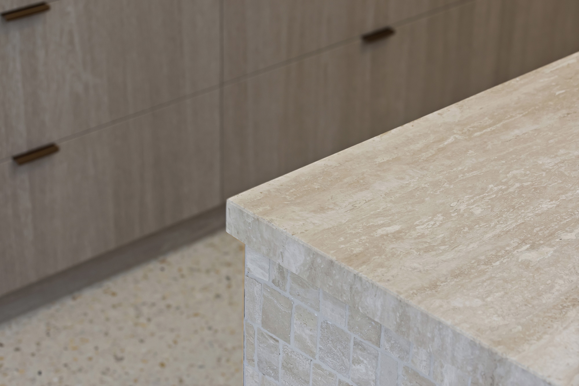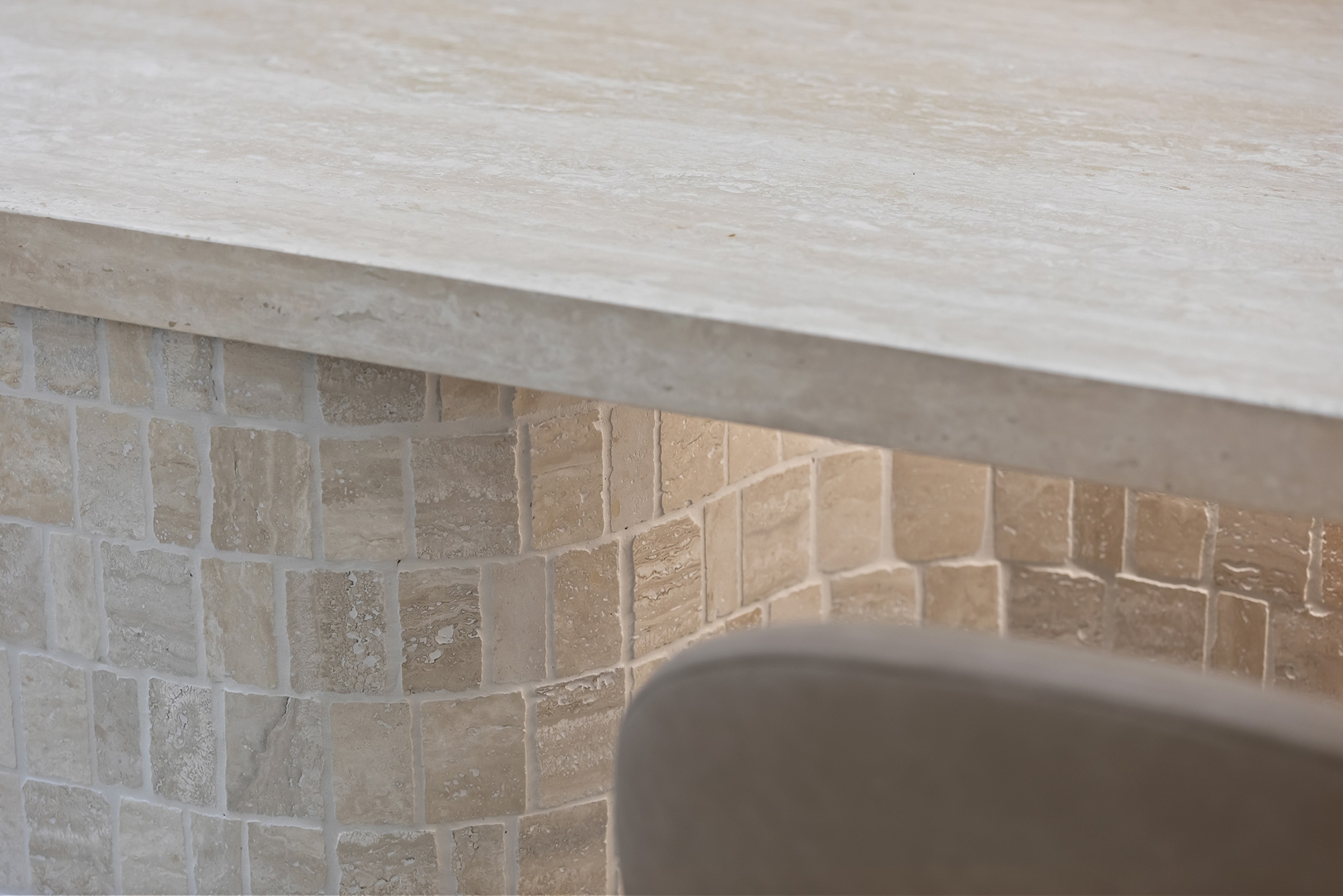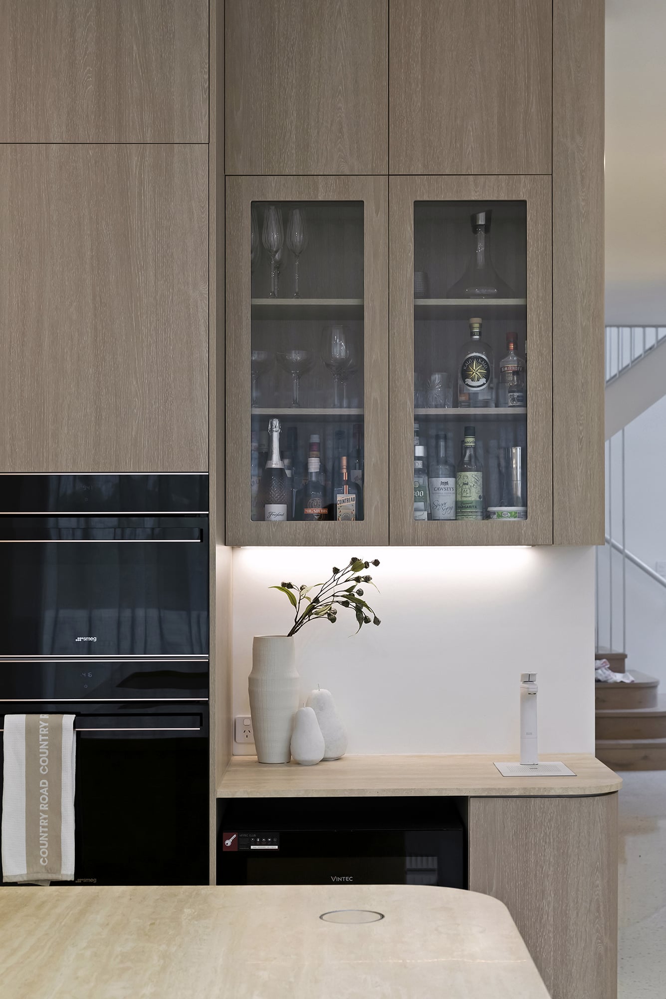 This bayside Manly kitchen reflects a balance of soft coastal tones and refined sophistication. A key design challenge was integrating functional elements into a highly stylised aesthetic. The statement mosaic-clad rangehood and curved island, with matching stone detailing, provide sculptural appeal while maintaining practicality. Soft timber tones, integrated appliances, and warm ambient lighting soften the clean lines. The client sought a kitchen that was both a showpiece and a functional hub — the solution delivers with seamless flow, considered storage, and tactile materials that elevate everyday living.