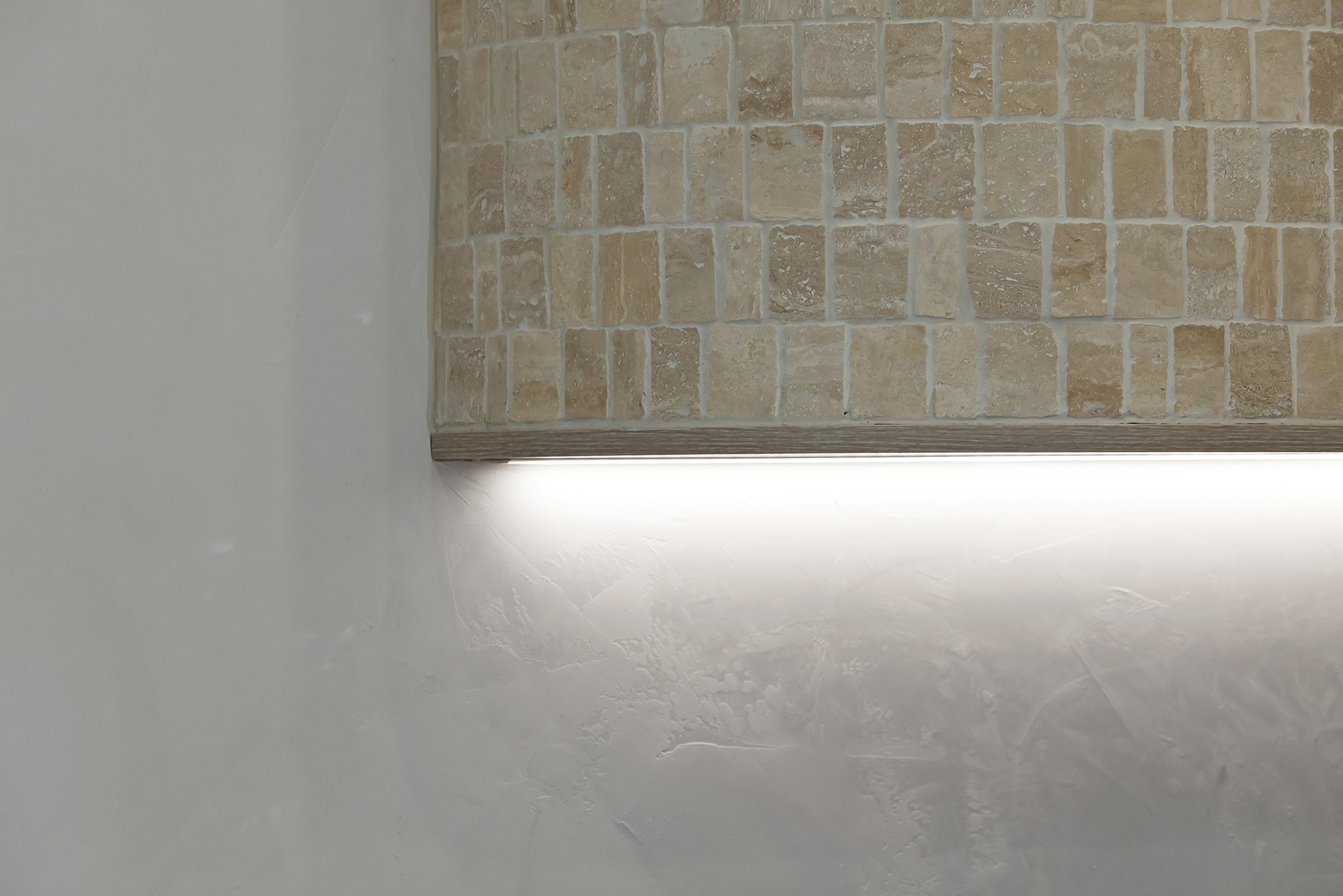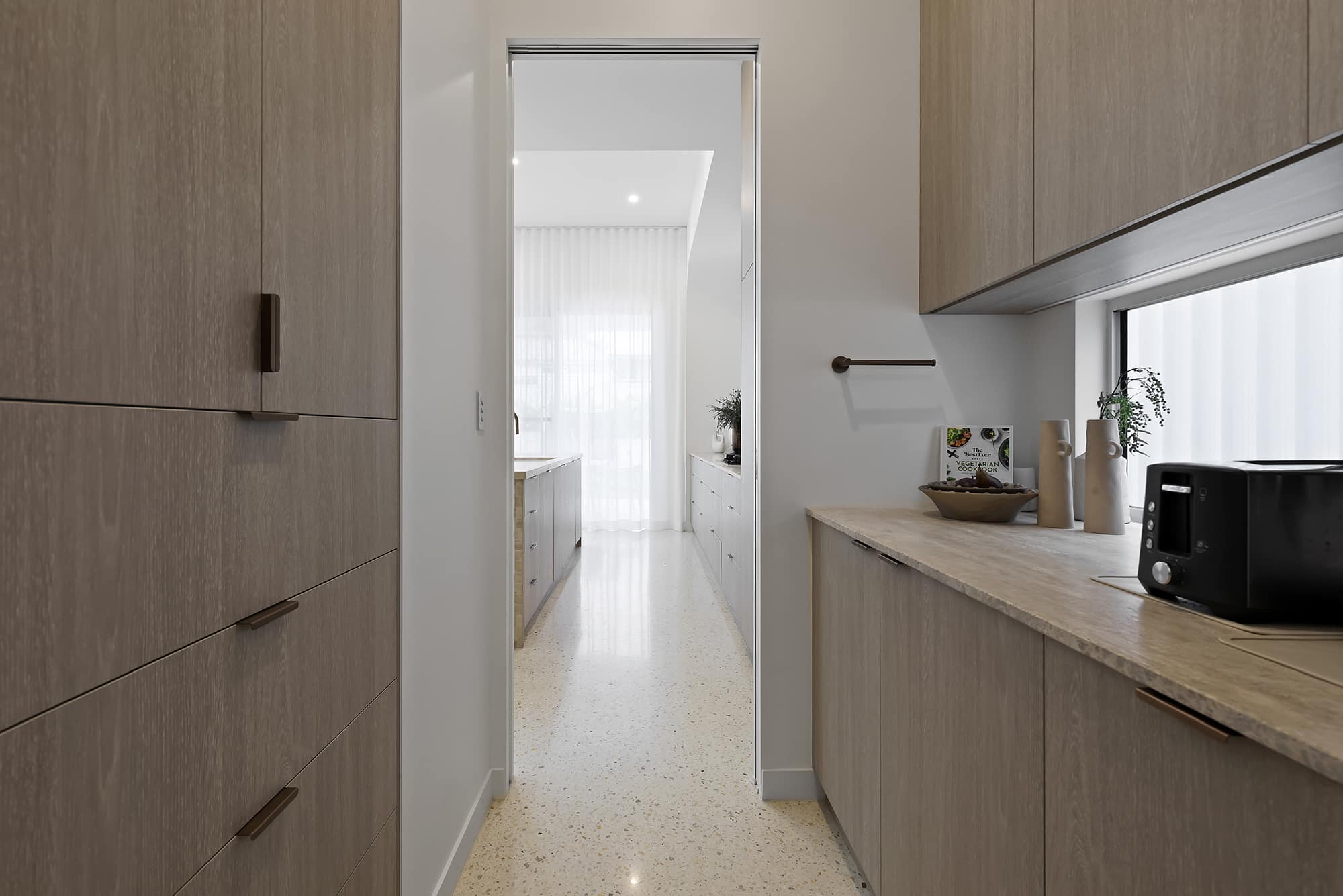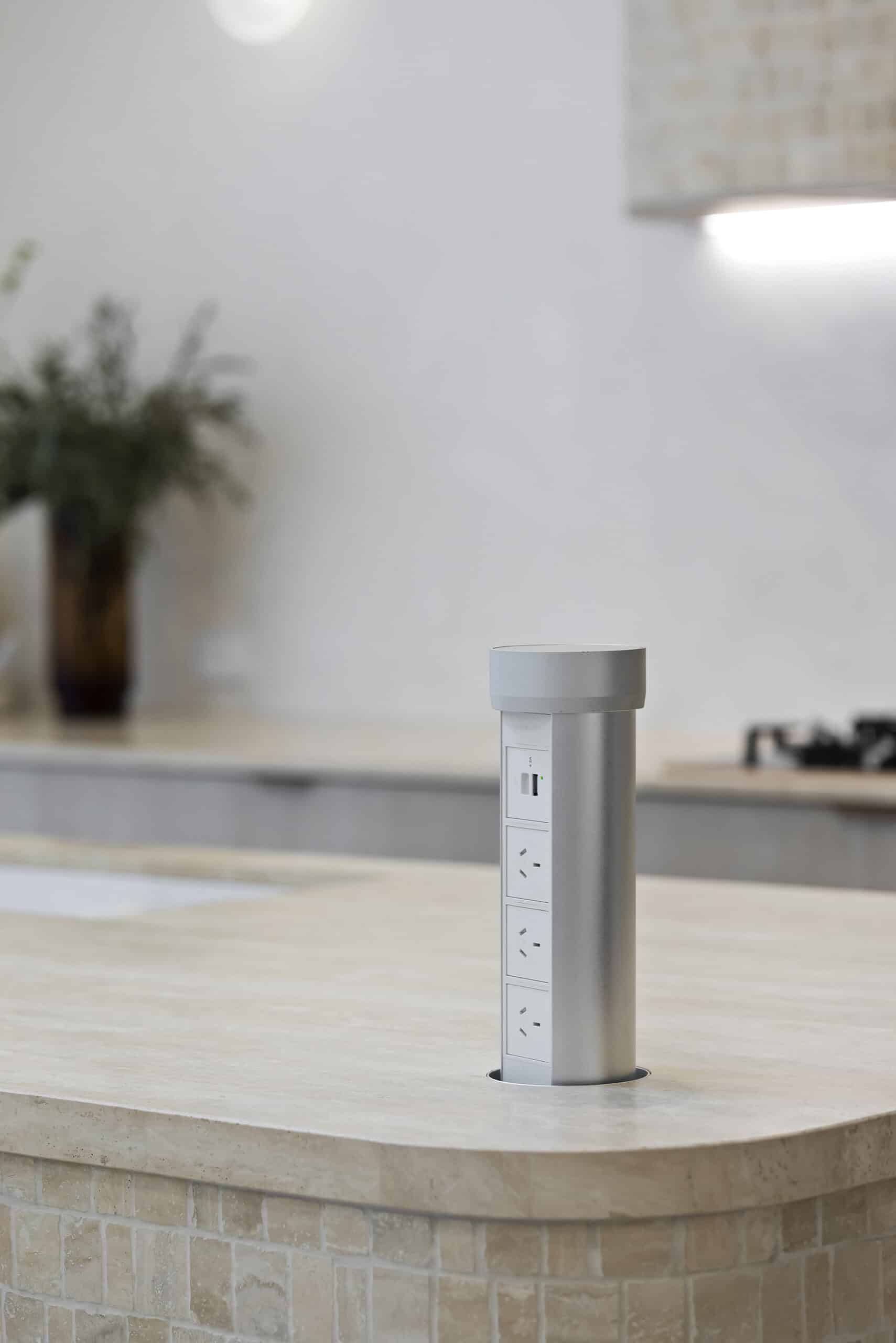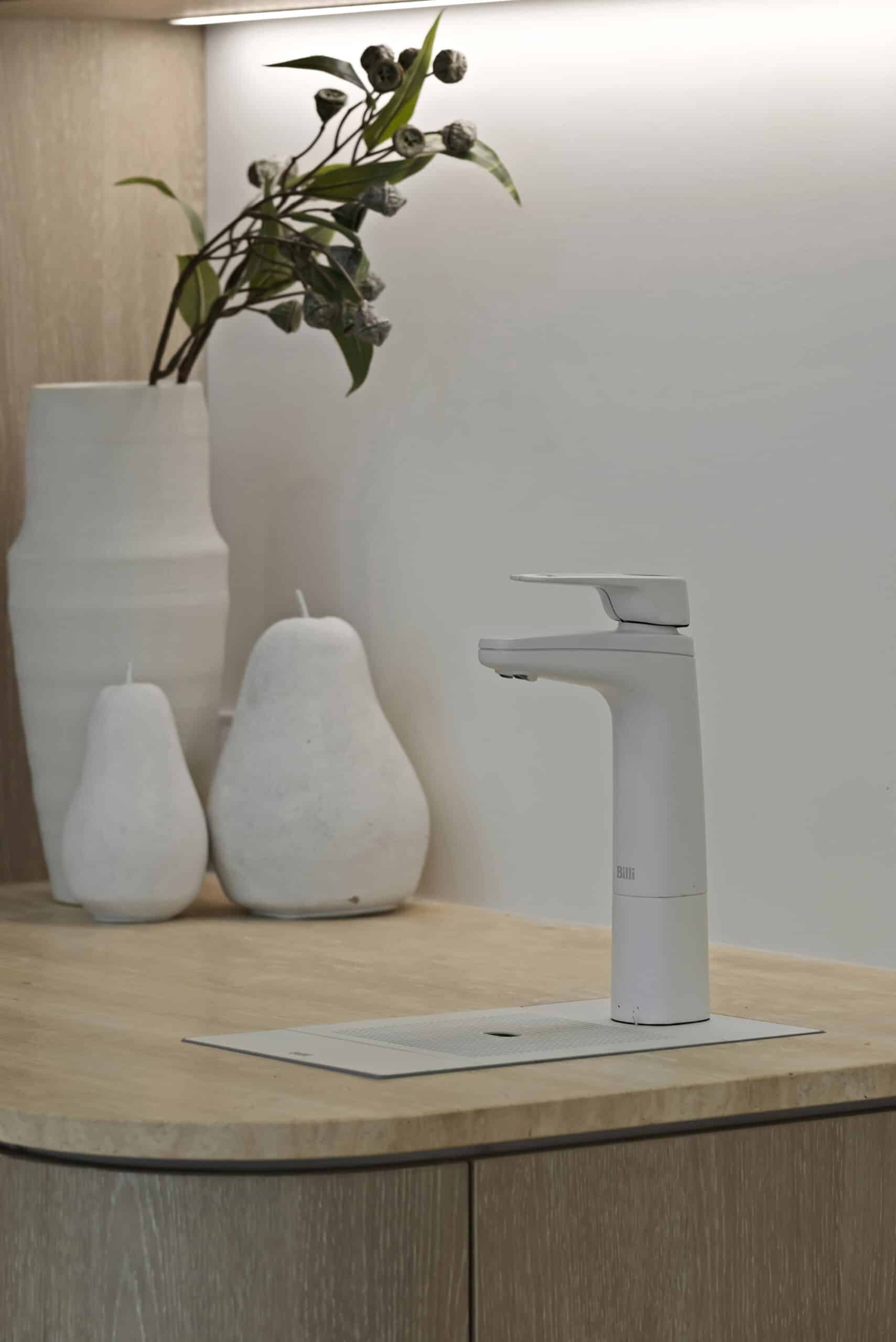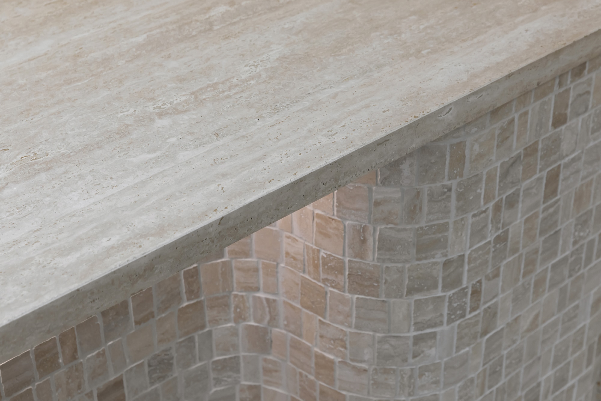This bayside Manly kitchen reflects a balance of soft coastal tones and refined sophistication. A key design challenge was integrating functional elements into a highly stylised aesthetic. The statement mosaic-clad rangehood and curved island, with matching stone detailing, provide sculptural appeal while maintaining practicality. Soft timber tones, integrated appliances, and warm ambient lighting soften the clean lines. The client sought a kitchen that was both a showpiece and a functional hub — the solution delivers with seamless flow, considered storage, and tactile materials that elevate everyday living.