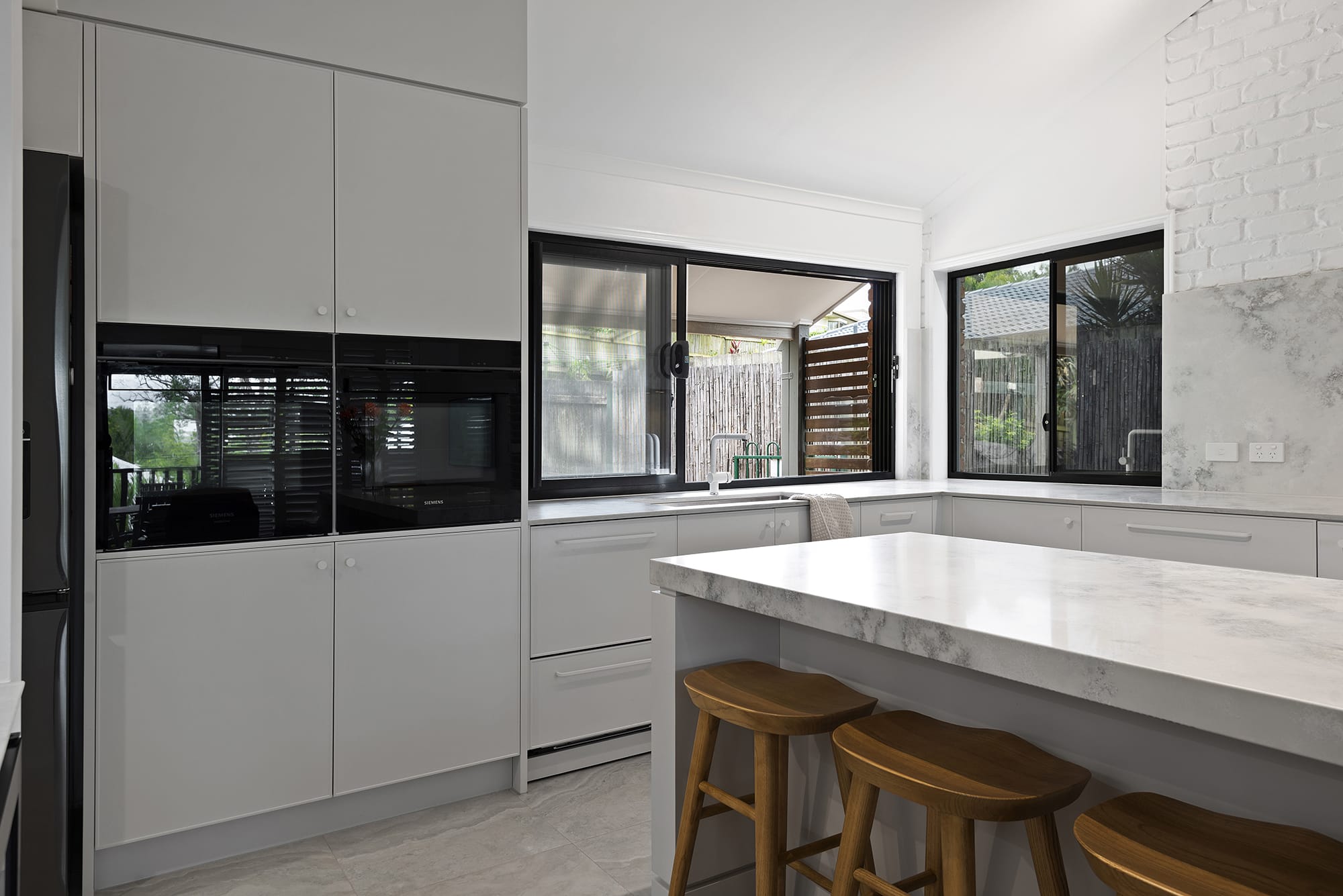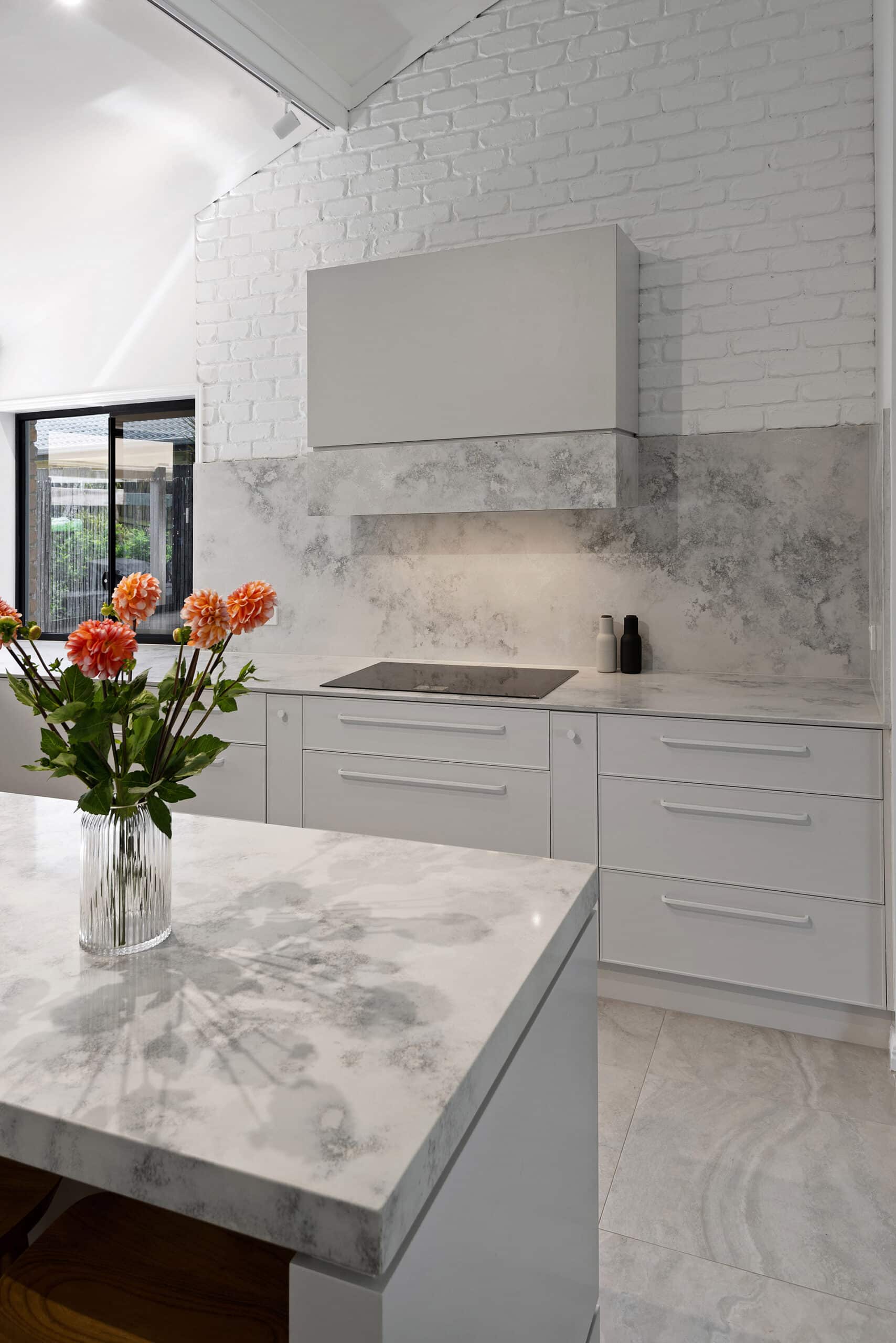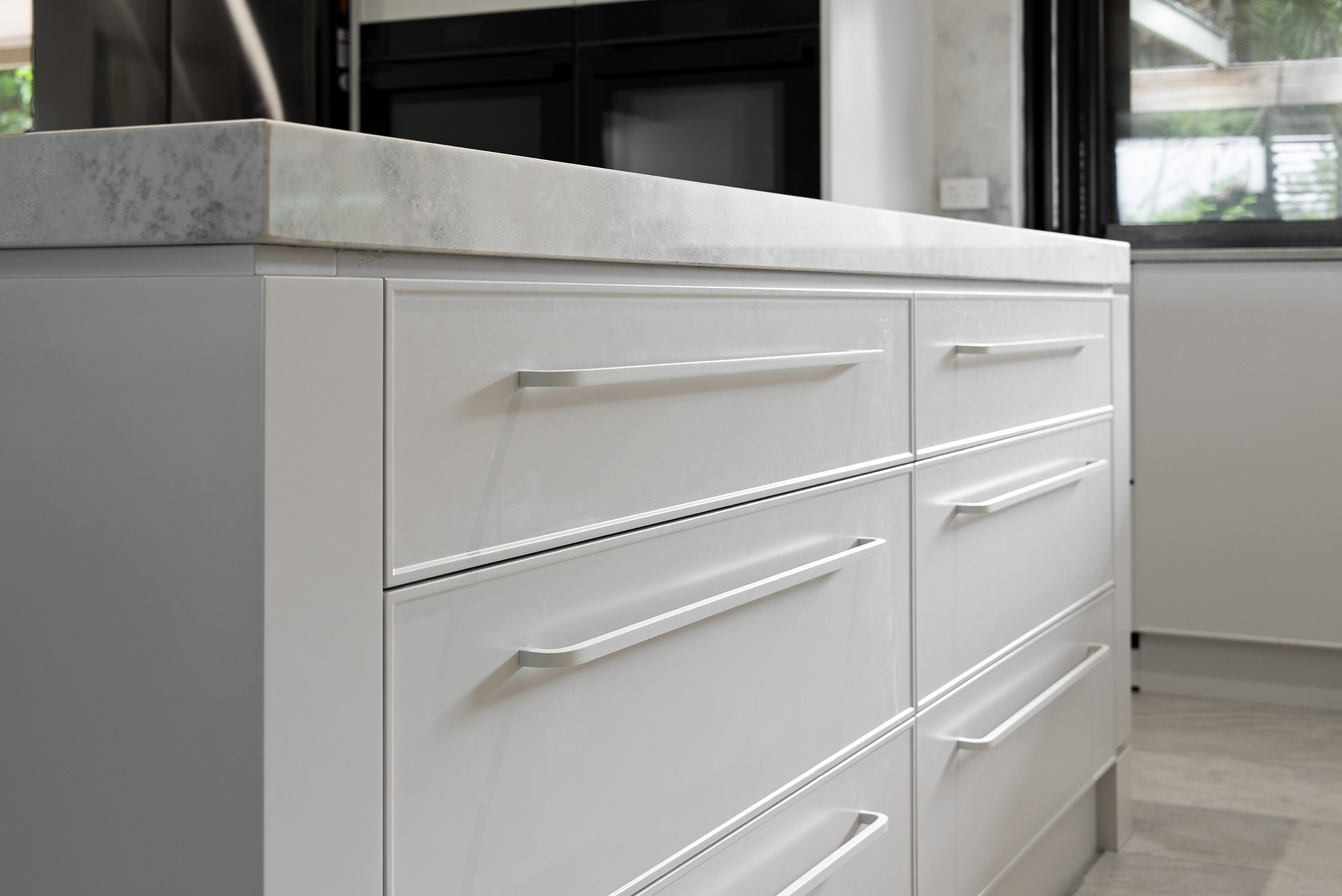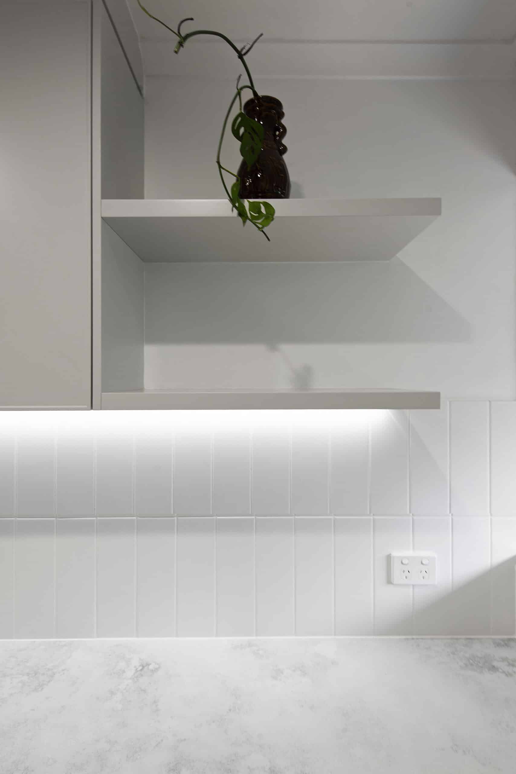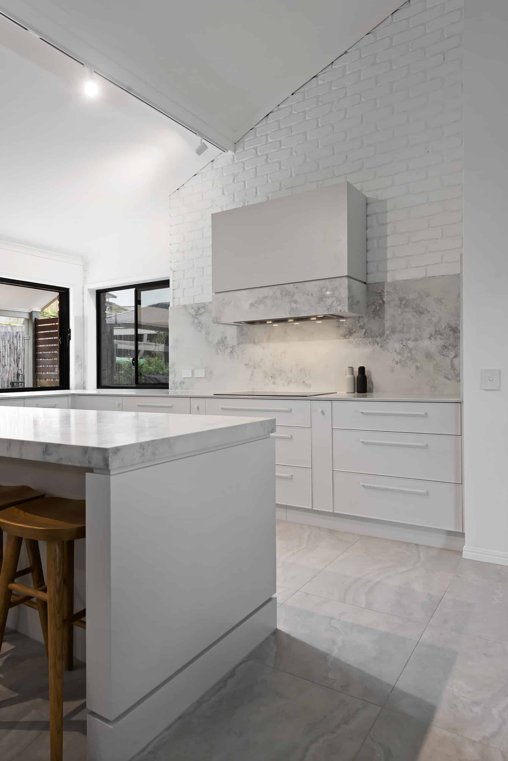 While maintaining a clean, simple aesthetic, thoughtful design elements were introduced— such as the slim-profile Chifley door, shark nose edging to the benchtops, and white handles and knobs that seamlessly blend into the palette. Statement features, without being over the top, include a partially stone-clad rangehood cabinet and a bold, chunky island to match, bringing subtle drama and balance to the space.