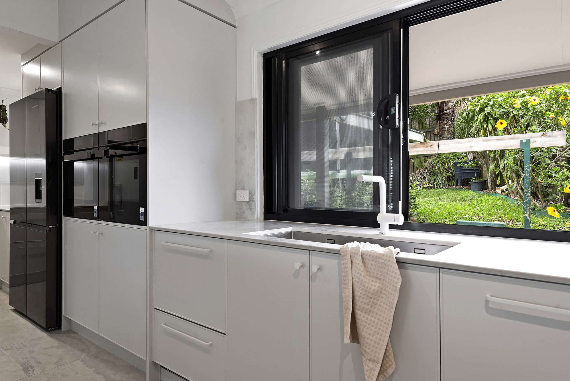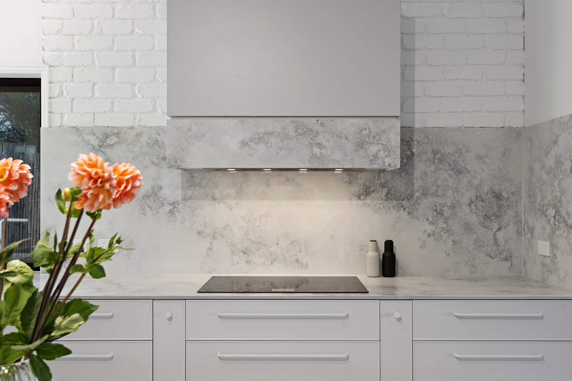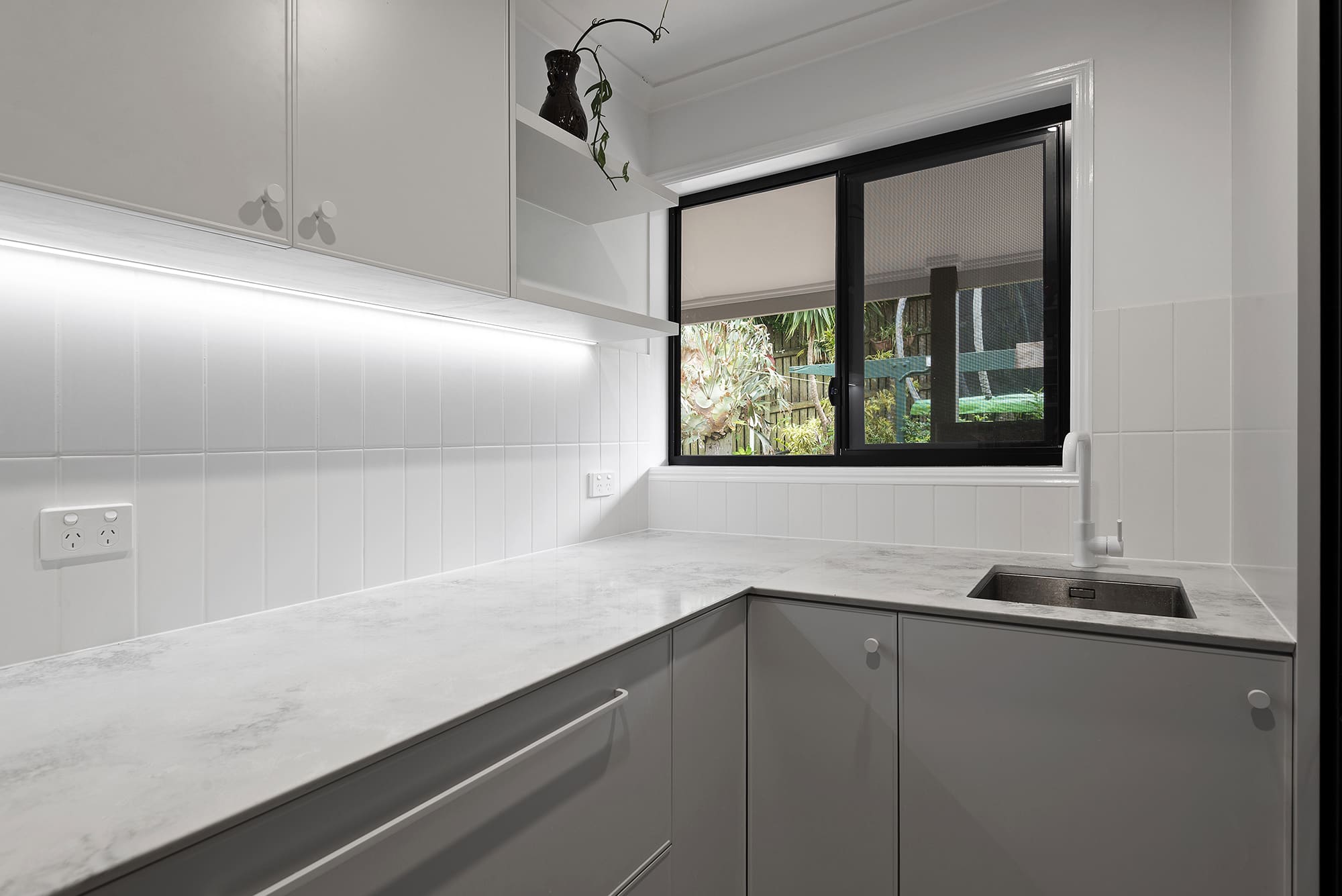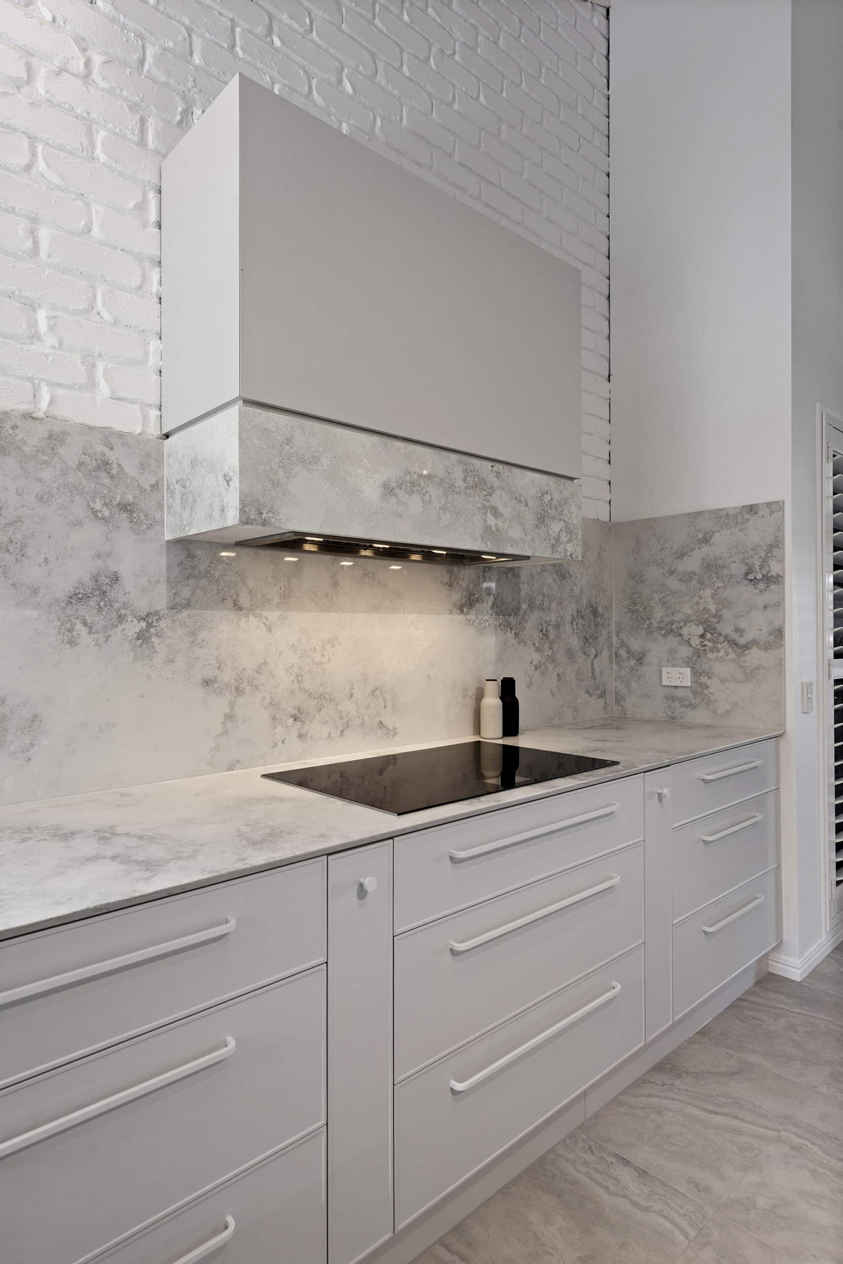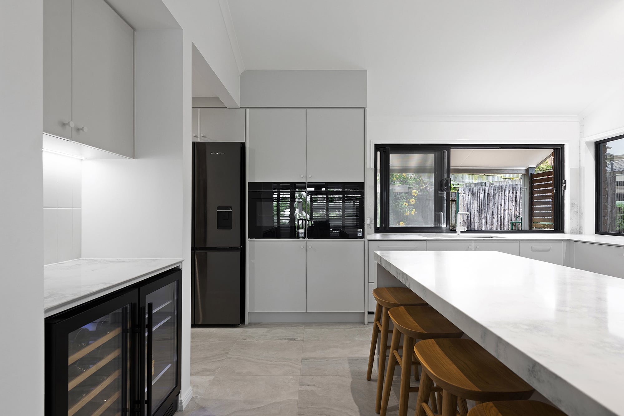 While maintaining a clean, simple aesthetic, thoughtful design elements were introduced— such as the slim-profile Chifley door, shark nose edging to the benchtops, and white handles and knobs that seamlessly blend into the palette. Statement features, without being over the top, include a partially stone-clad rangehood cabinet and a bold, chunky island to match, bringing subtle drama and balance to the space.
