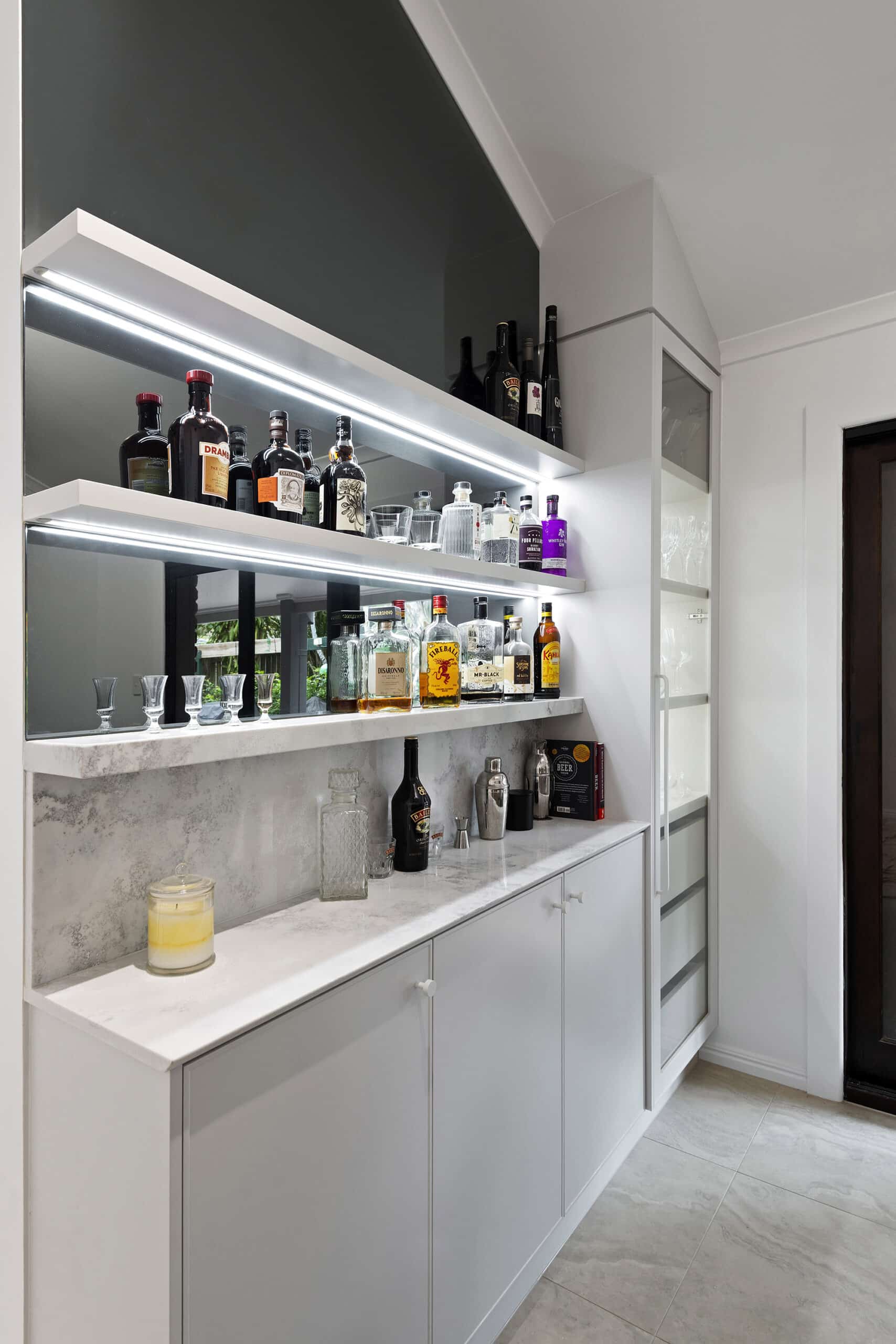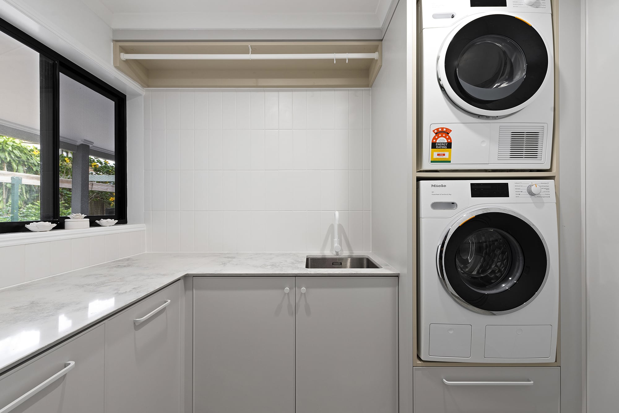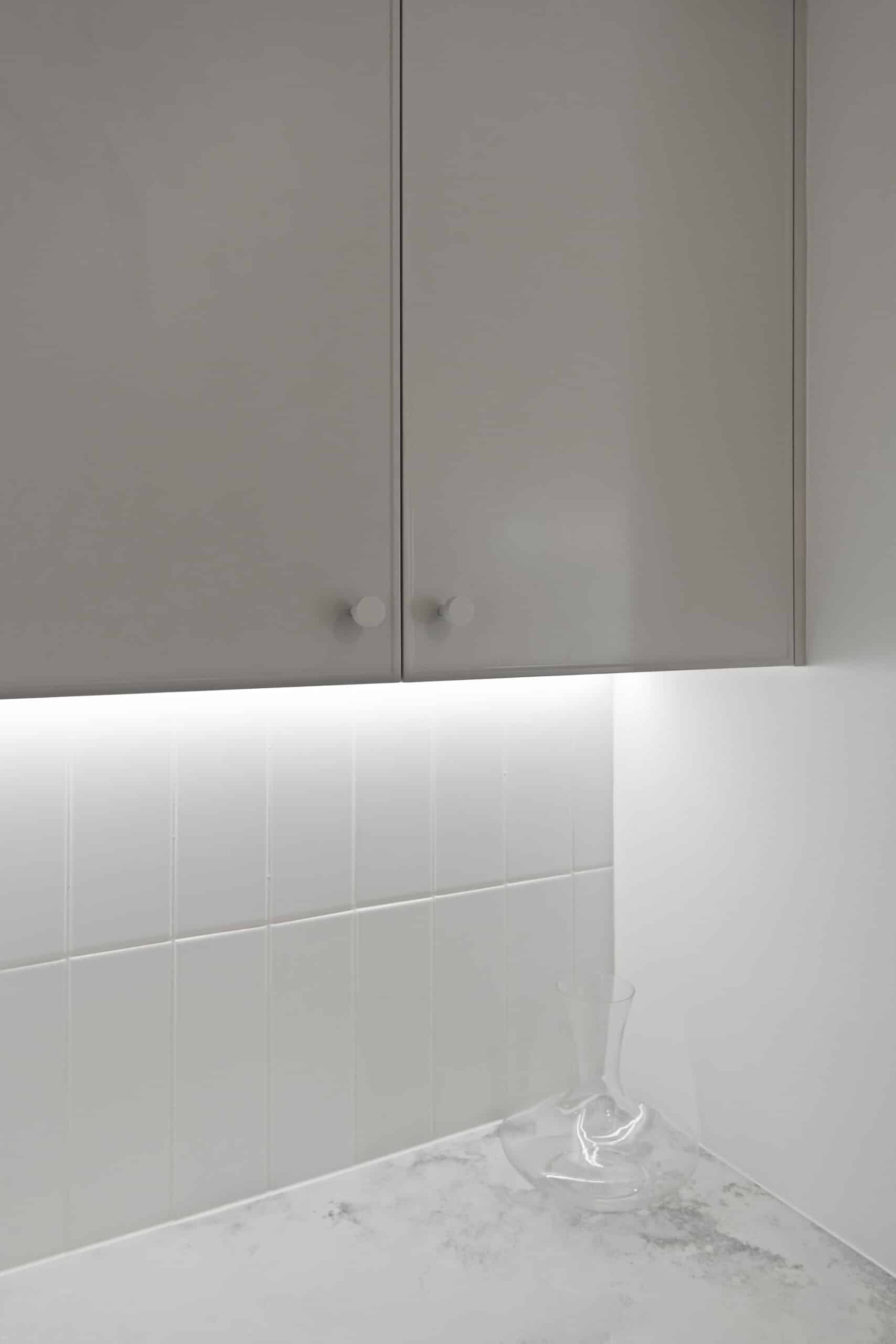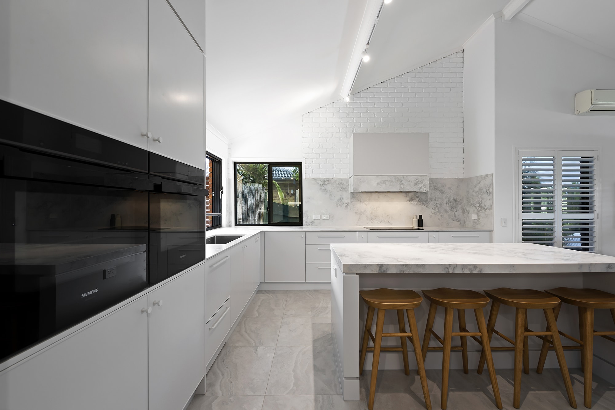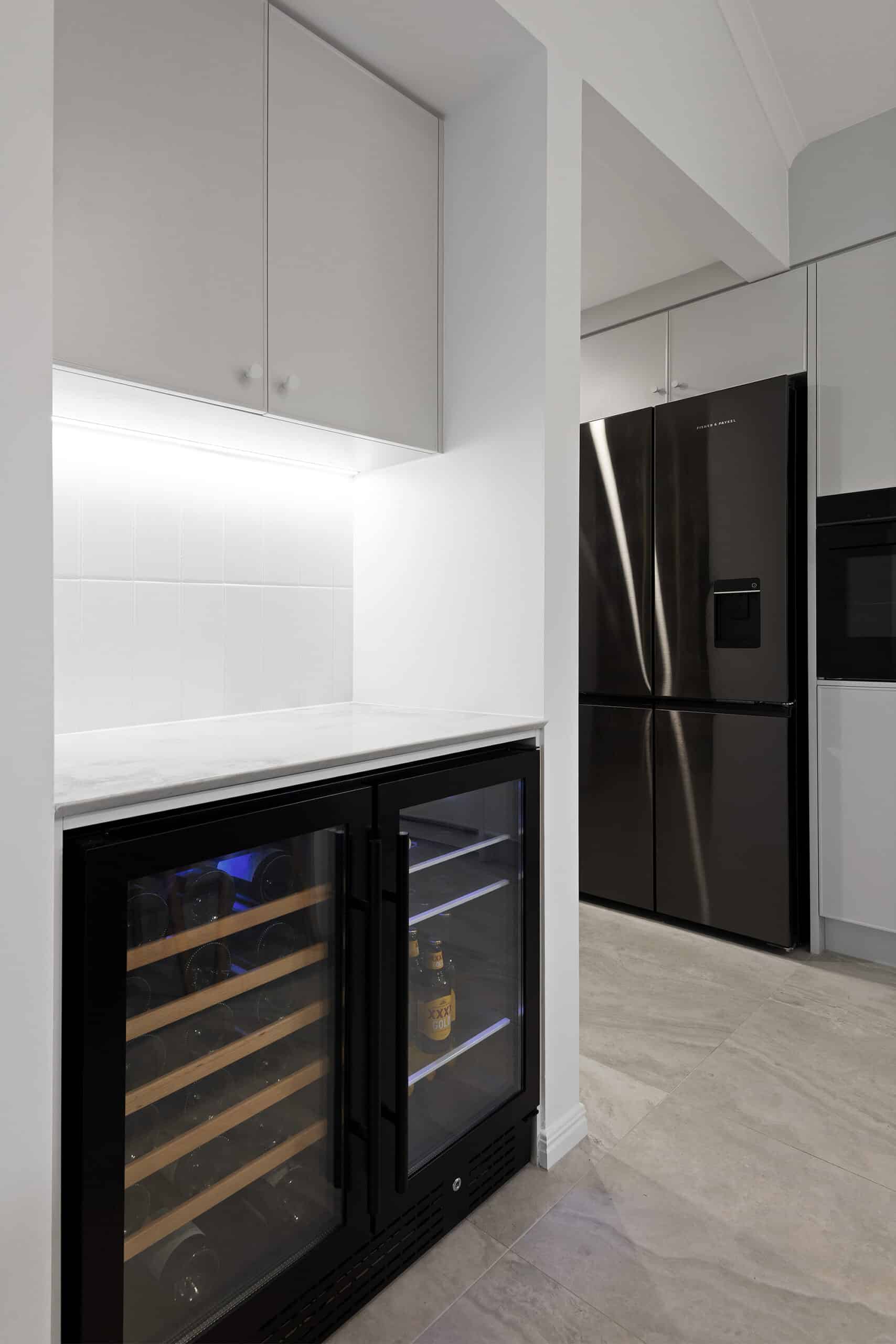 While maintaining a clean, simple aesthetic, thoughtful design elements were introduced— such as the slim-profile Chifley door, shark nose edging to the benchtops, and white handles and knobs that seamlessly blend into the palette. Statement features, without being over the top, include a partially stone-clad rangehood cabinet and a bold, chunky island to match, bringing subtle drama and balance to the space.